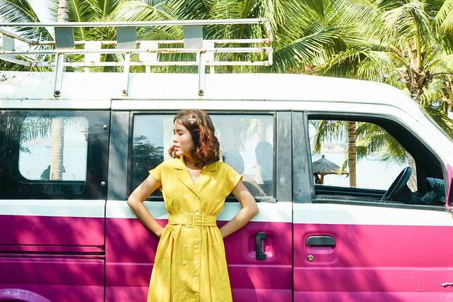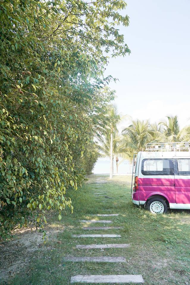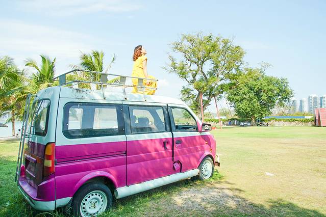 想要到达海滩,得迈过一片草地。有趣的是,草坪上竖放着很多适合拍照的道具,而我却对那辆紫红色的老汽车情有独钟。可以打开车门坐在里面拍,也可以爬到车顶上。但是爬上车顶的时候要格外小心,注意安全。坐在车子里,感觉自己就是这里的女主人!哈哈。