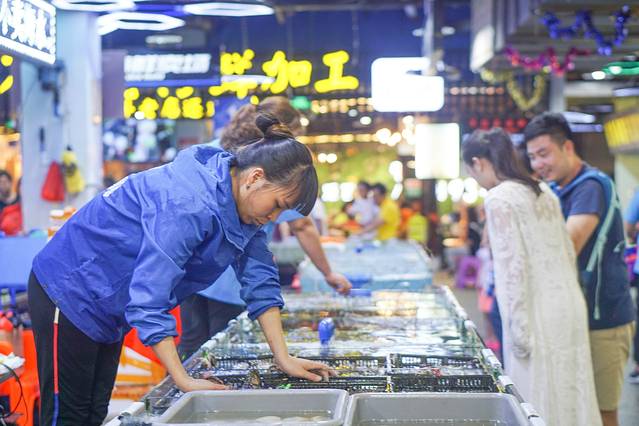 在亚龙湾有一个著名的海鲜加工广场,名叫“奥特莱斯量贩式海鲜加工广场”