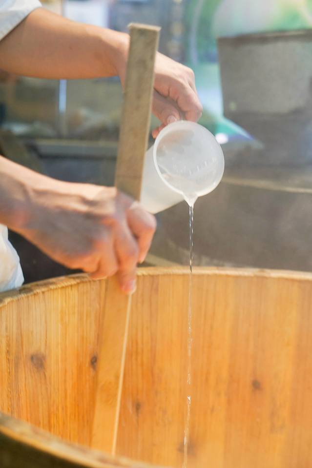 其中有个过程是拿着木棒和量水杯,一开始我很困惑。问了师傅才知道。他是把盐卤用清水兑开,倒入豆浆里;慢慢滑动豆浆,使卤水与豆浆混合均匀。