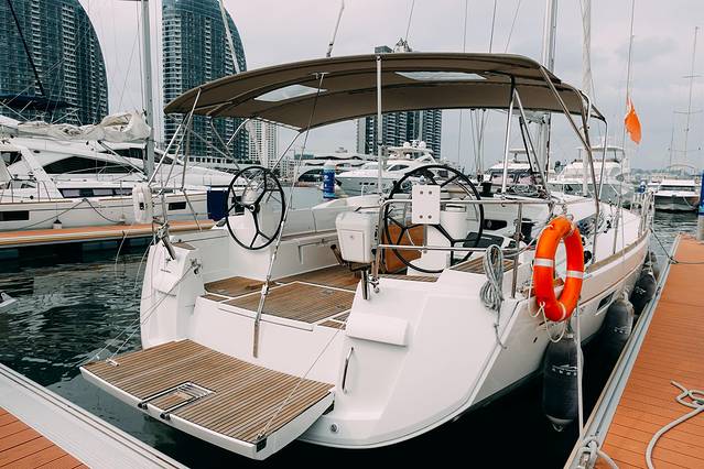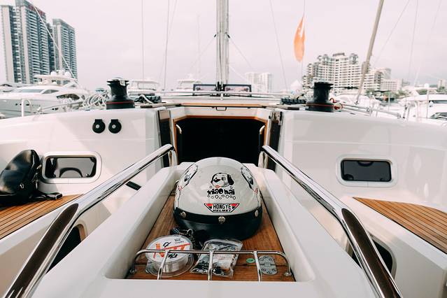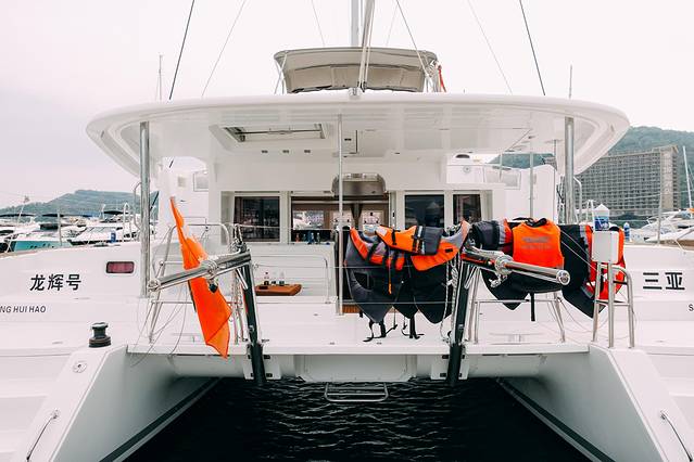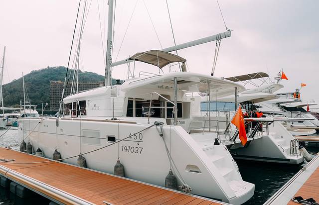 这次乘坐的是法国蓝高450双体帆船-船体高贵炫目,拥有两个上船阶梯,左右两边均可登船至甲板。这个双体帆船和平日里见过的都不太一样,非常有意思。相比普通的游艇来说,帆船的参与性和互动性是更高的。