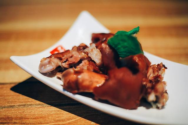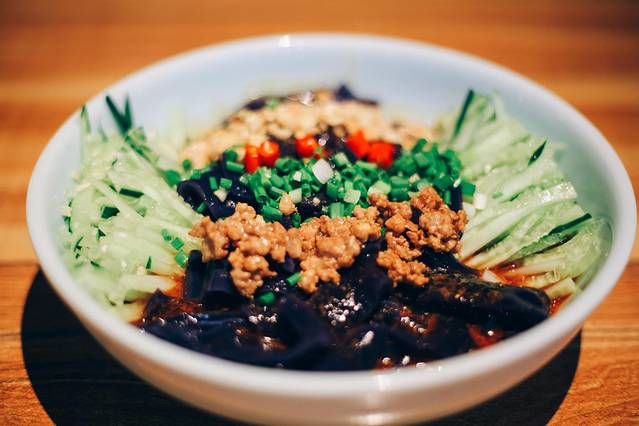 这里的菜品制作还是比较精美的,在摆盘上面也是有小心思的。首先上来的是一份凉菜,有机黑米拉皮。
