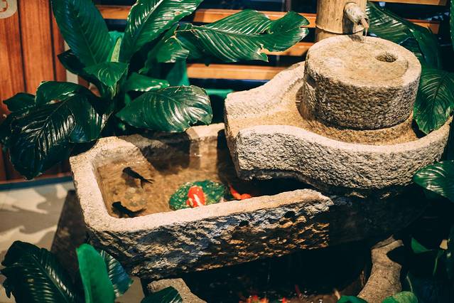 进店后就能看见这样一个石墨的装饰物,不仅流着水还养着金鱼,看着就让人觉得很有生机。