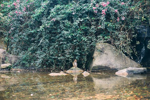 最有意思的是这只蹲坐在水中间的小猴子,一动不动的,可爱极了。我们盯了它很久,也不见有丝毫起身的架势,着实有意思。