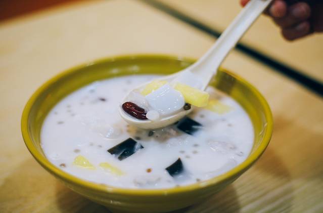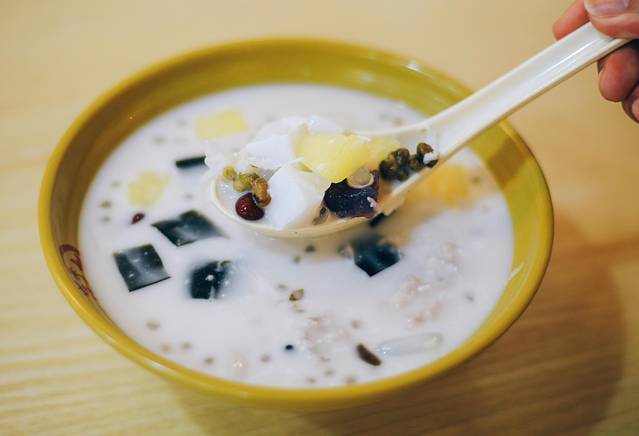 我们点的是椰奶清补凉,这一勺下去,满满都是“干货”呀!清补凉被誉为“舌尖上的清凉”。曾被苏轼誉为“椰树之上采琼浆,捧来一碗白玉香”。