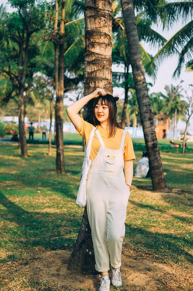 倚在一颗椰子树上,看一看不远处野炊的人们儿。