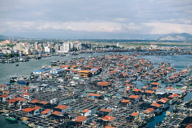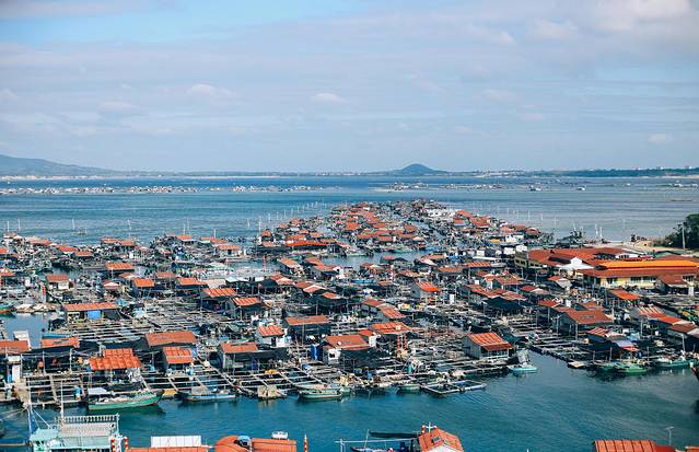 在索道上可以看见海面和堆砌在海绵的渔船。这是很多渔民生活的地方,成群成片,异常热闹。