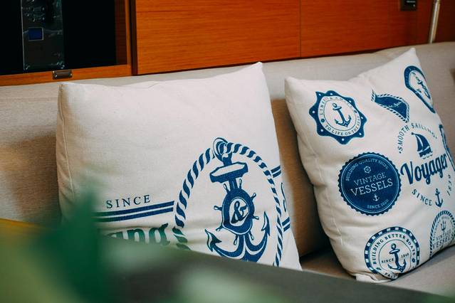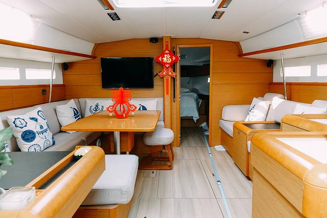 船舱自带海景窗,舱体内客厅非常大,因为是双体帆船,体型较宽,可以容纳10人同时参与茶会或者沙龙。