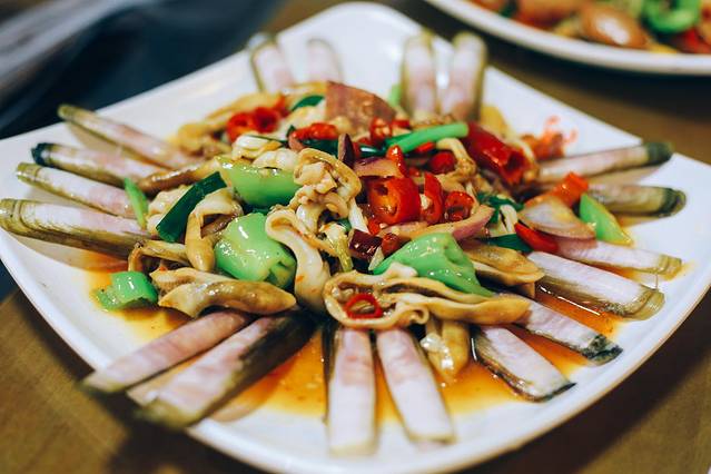 辣炒蛏子,口感和芒果螺有点类似,这个摆盘很漂亮,看着就让人食欲大开呢。