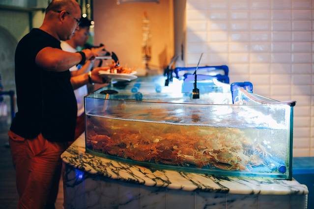鲜活区的海鲜都是选好了当场打捞出来,还需要盖上盖子以免“虾兵蟹将”的逃窜。这里的海鲜还会根据季节有所调整,保证顾客吃到当下应季最新鲜最美味的食物。