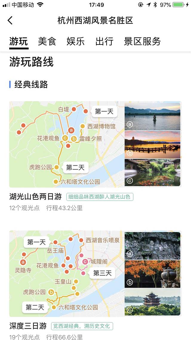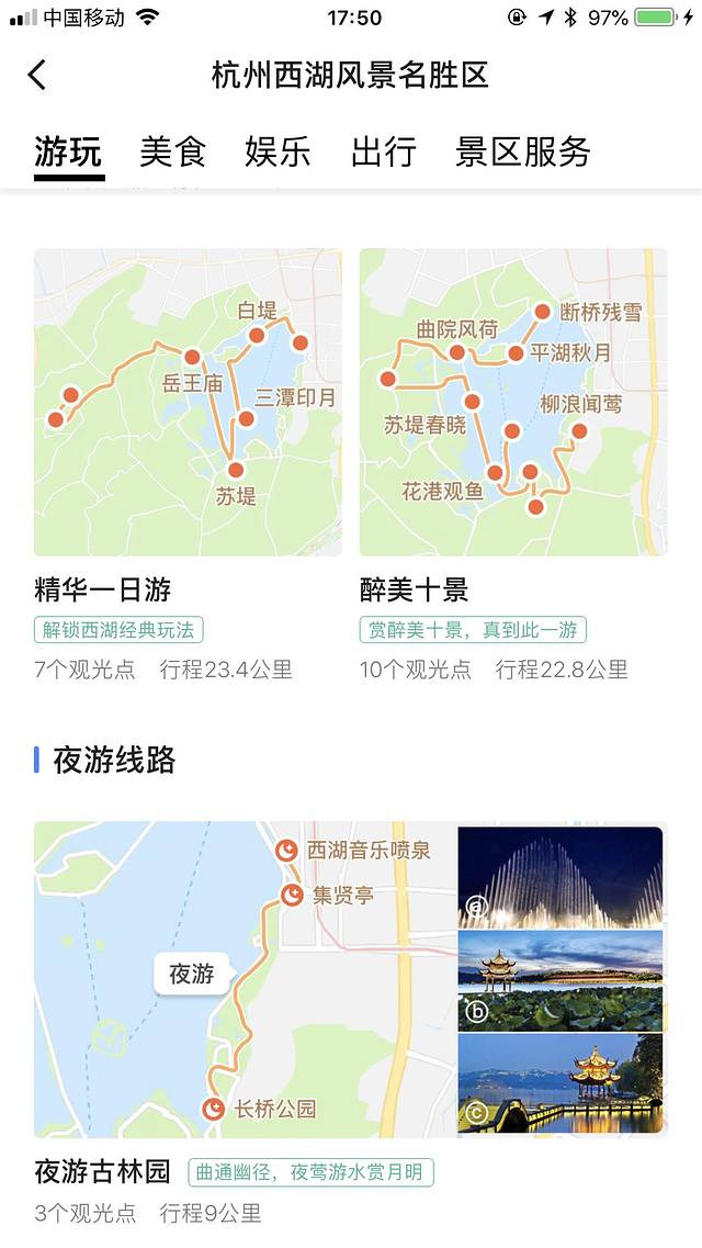 高德地图很贴心的把基础线路推荐根据旅行天数划分一日游、二日游、三日游。第一次来杭州的朋友,可以选择最为经典的“湖光山色两日游”,西湖边最标志性的景点都包含进去了。你只需要照着线路走就行了。另外春季游西湖的,可以选择我认为特别小众的“茶文化之旅”线路,去解锁湖边的片片新绿;喜欢钻研历史的可以选择“文化史迹二日游”,饱览自古钱塘的绝代风华;喜欢看夜景、拍夜景的可以选择“夜游古林园”线路,西湖边的夜景绝对不会让你失望的;喜欢骑行越野的朋友则可以根据自己的喜好选择“沿湖骑行”或“越野骑行”,去感知一个动静相宜的西湖。