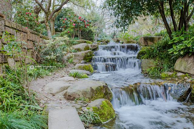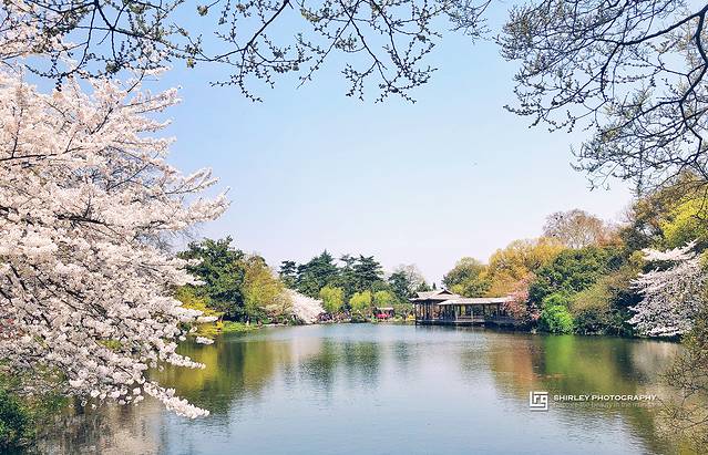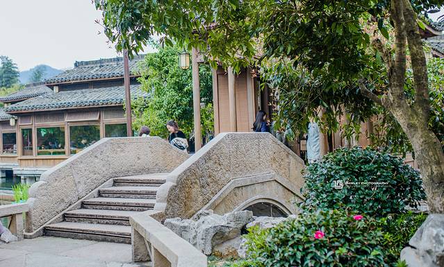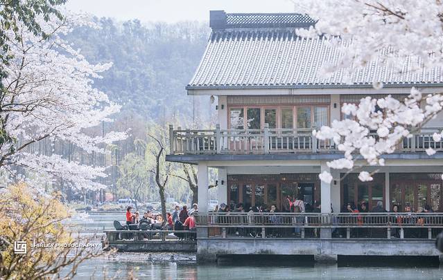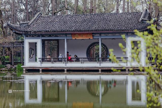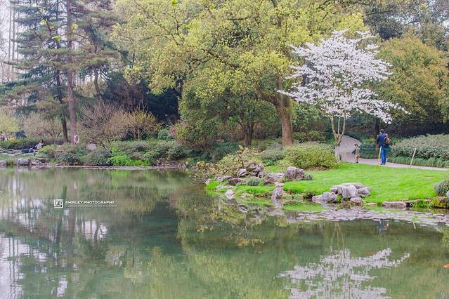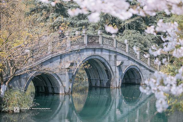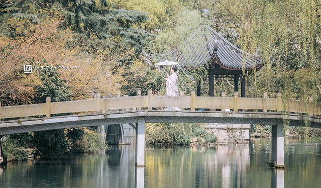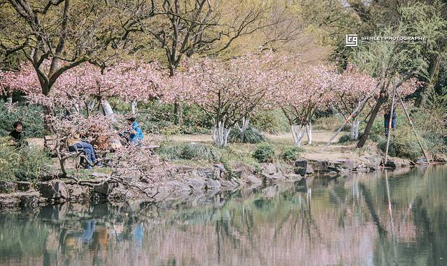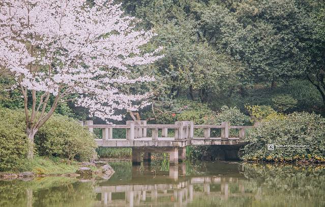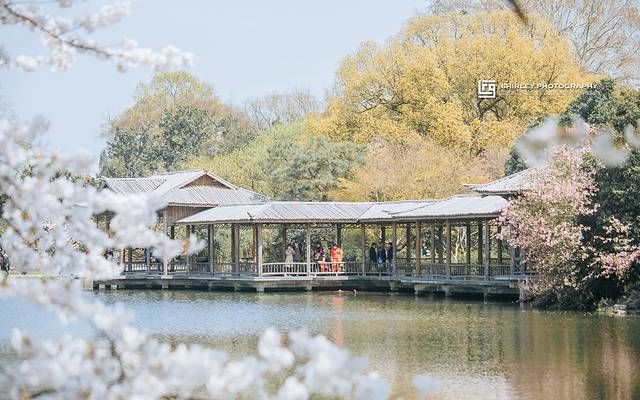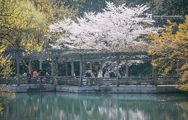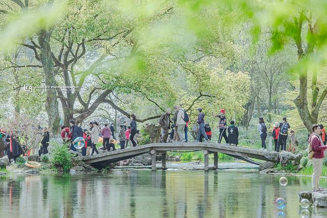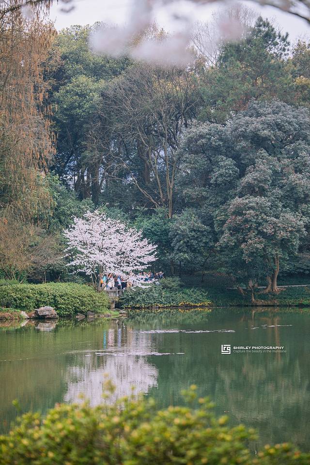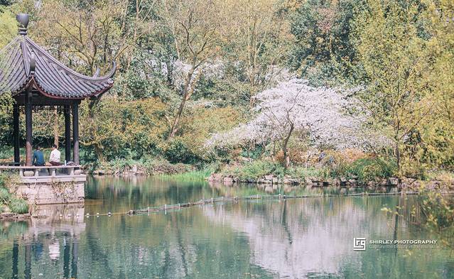 如果你和我一样喜欢清静,那么极力推荐你从花港观鱼的南门进入公园,就是距离太子湾公园最近的那个门,行程上很顺。南门有个相对独立的区域叫作芍药圃,由于不在公园的核心地带因此人很少,旅行团也不会光顾。但是这里亭台楼阁,池塘石桥一样不少,也有着西湖春天标配的樱花。只有三两当地人,和几拨前来取景的古风摄影工作室。