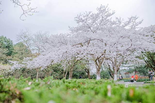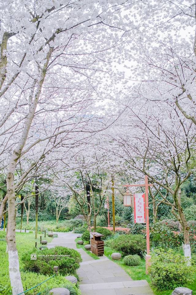 适逢玉兰花季的尾声,走在公园的大道正像是穿行在夏日的浓荫底下,只是此处由白花替代了绿叶,是城市里难得的手笔。行车驶过花荫,起了一阵风,带落低枝上的花瓣,在骑车人身后飘舞,像一串袅袅的余音,一股子香气氤氲园中。而在百花争艳的春天,公园里的樱花却开得如火如荼。确切地说,整个杭州城正处于樱花满开的绝美时刻。