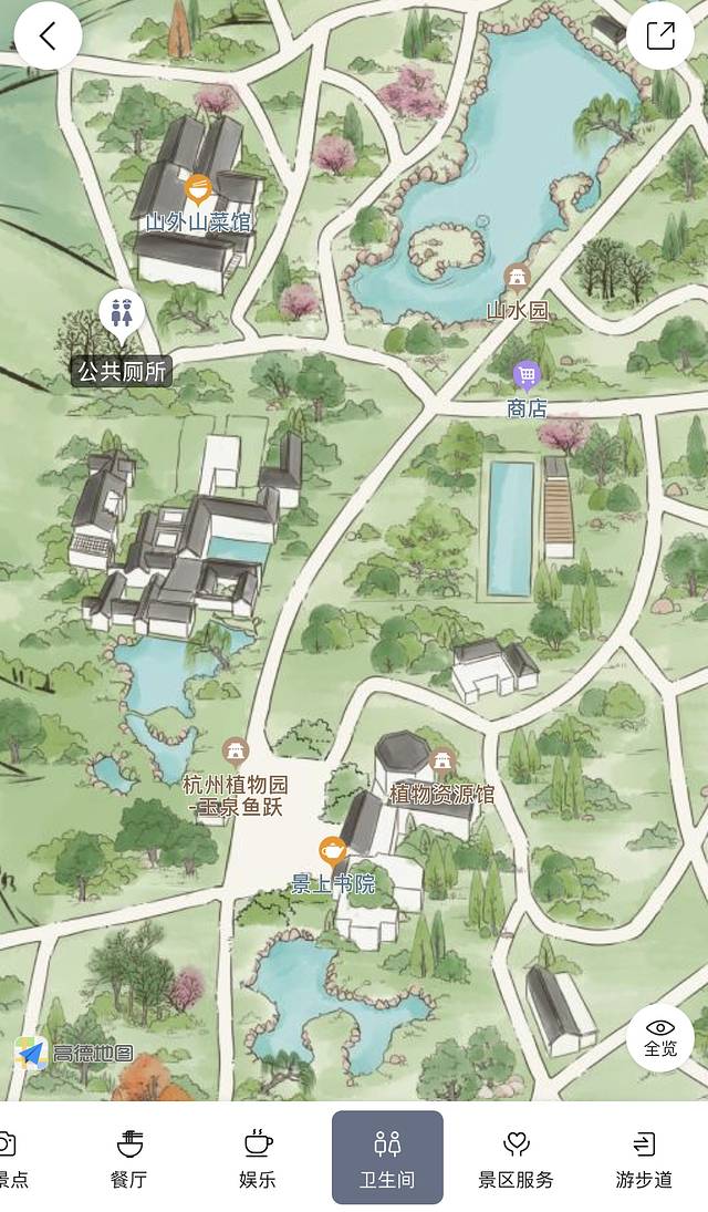 公园非常大,被玉古路分割成两个区域。从东门进入后,方向感不好的我只能全程依赖高德地图的实时导航,才不至于走错路;并且不会错过攻略上推荐的点,连附近的卫生间都能显示,让独自出行的我安全感大增,少了后顾之忧。