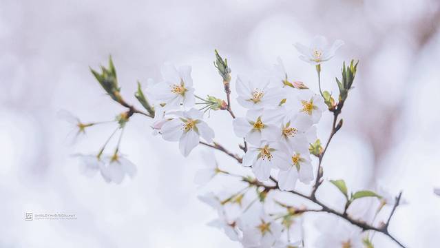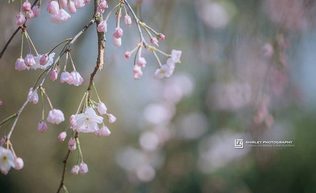 樱花花色较浅,单朵柔粉,呈簇状。若要拍密匝匝的一片,会让画面失去焦点,趋于平淡。不妨对焦在一小簇樱花。突出前景,虚化背景,增加樱花的细部和质感。