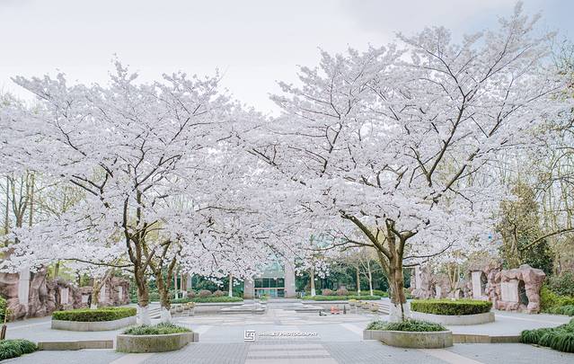入园后就是一改杭州婉约画风的莳花广场,大开大合的轴对称式布局,还有些许欧式风格的影子,让人眼前一亮。四株满开的染井吉野如身披白雪,树下却寂寂无人。比起适才的太子湾公园,简直是两个世界。