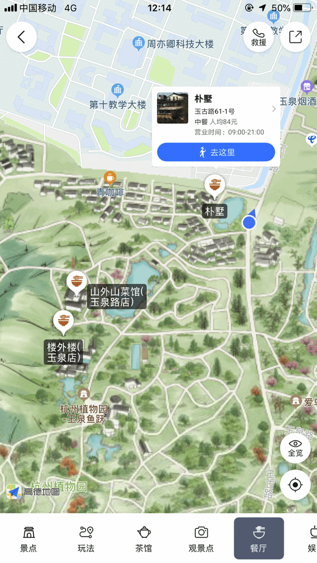 手绘地图上还有美食推荐,有个专门的餐厅好评榜,可以根据当前位置查找附近餐厅,人均消费和营业时间都标注的很清楚。去杭州植物园一带都推荐去青芝坞用餐,无论氛围还是风格都很适合年轻人。北面就是浙大,所以这一带的餐厅走的都是价廉物美路线的,适合学生情侣吃饭聚会劈情操。