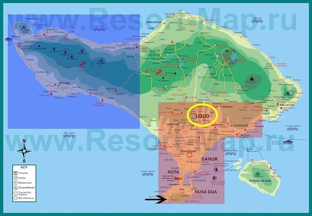 3)如果你酒店选在了乌布附近(黄色圈圈指示),建议你不要错过图片上的纯绿色区域(中北部/东部),因为小众景点大都在那边,而且你比住在南部的游客更有位置优势,轻松省去一半车程。