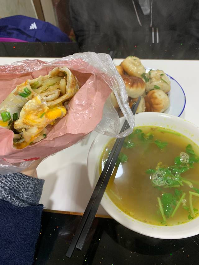 酒店旁边有个舒蔡记,生煎包挺好吃,皮脆脆的,还有个牛肉粉丝汤,我手里的是蛋饼加各种菜