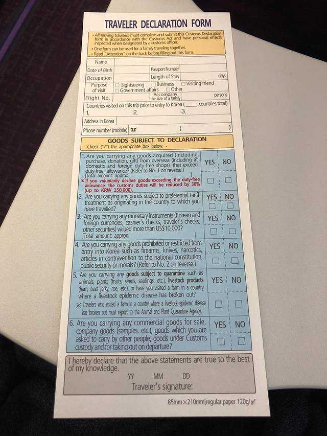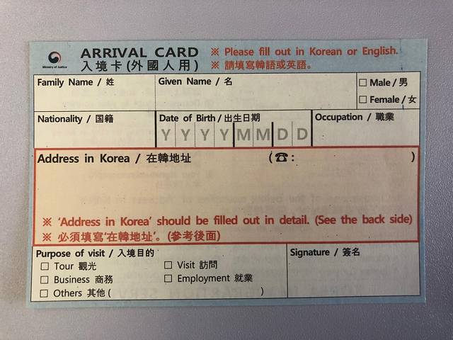 韩国 入境卡,在飞机上,空乘人员会给你发。