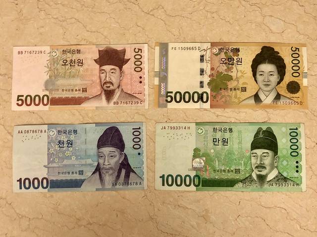 韩国 ,纸币有四个面额,1000won、5000won、10000won、50000won。
