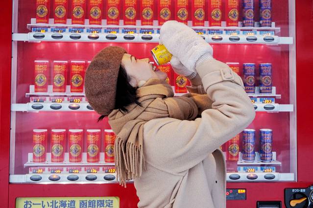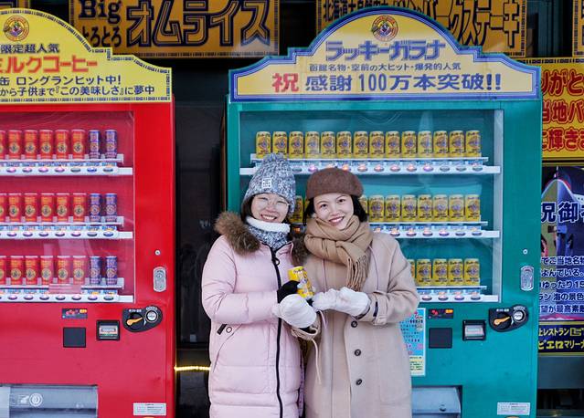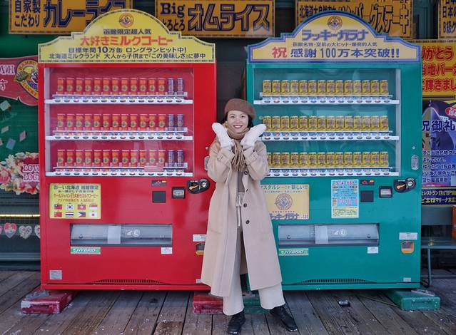 在金森仓库门口,我们被小丑汉堡店外五颜六色的饮料机吸引,复古的红绿配色是个出片的好场景。至于饮料机广告词上的“函馆限定人气 销量突破100万罐”的碳酸饮料,虽然正值放学,我们看到不少穿着制服的当地学生都会三五成群前来购买,但经鲤鱼酥三人组中的美食特派员悦悦尝试,该饮料被评定为二星,看着悦悦一言难尽的表情,我和笺仔都停下了投币的步伐。↓