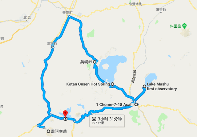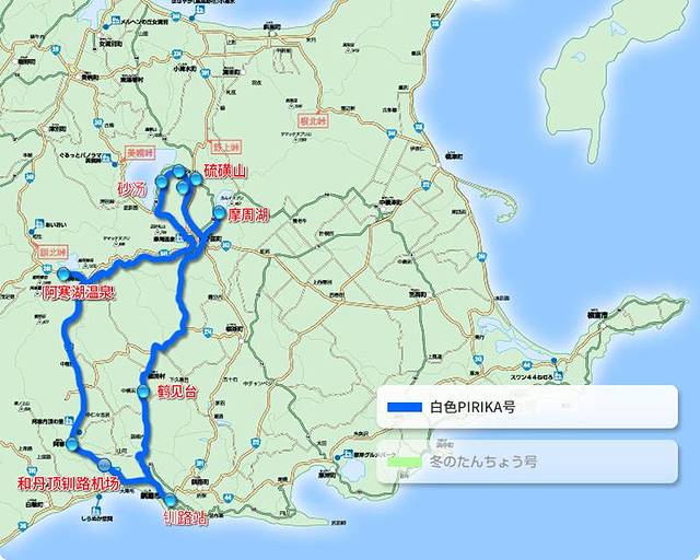 钏路王子酒店—(巴士)—鹤见台—(巴士)—摩周湖第一展望台—(巴士)—砂汤—(巴士)—硫磺山—(巴士)—阿寒湖温泉町—(走路)—新阿寒酒店