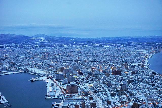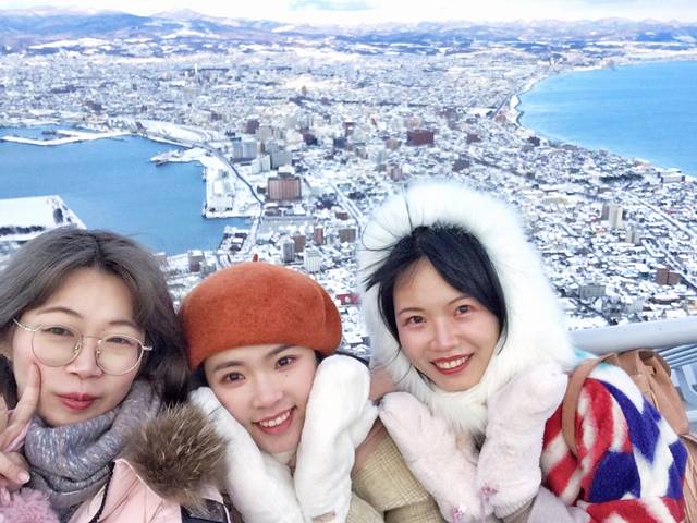 初到函馆是一个阳光艳艳的下午,太阳把整个城市晒得暖烘烘的。导航显示,从JR函馆站出发步行至酒店仅有10分钟的路程,但因为道路积雪的缘故,我们拖着沉重的行李箱仿佛走过了半个世纪,终于在20多分钟后大汗淋漓地抵达酒店。为了赶在团队游客到达之前占领函馆山展望台绝佳拍摄位置,我们办理入住后不敢过多耽搁,空着未吃午饭的肚子便匆匆跳上电车赶往函馆山。一路上我暗暗祈祷此行一定要天公作美,否则山顶景色势必会大打折扣。