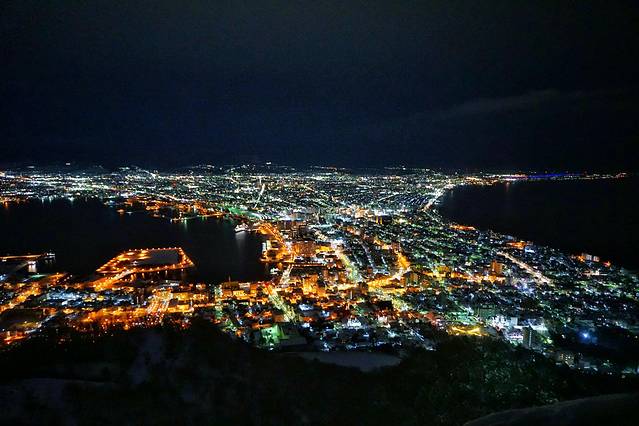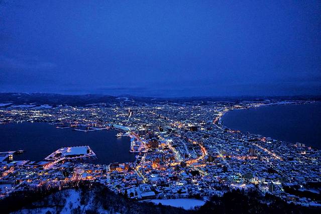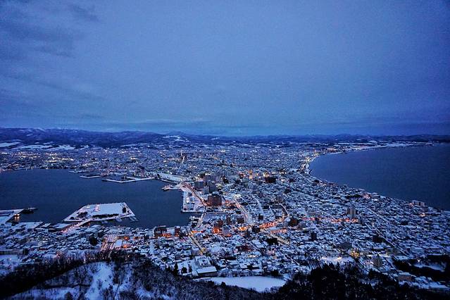 直到天空彻底被夜幕笼罩,不留一丝蓝意,我们才从人群中撤出,结束了今天历时3小时的拍摄工作。此时的函馆山已进入营业高峰期,不论是下山还是上山的缆车都排起了长队。单从我们的体会而言,其实此时天色全暗,已错过最佳观赏时间。如果时间和体力允许,最好于天黑前一个多小时(3点半前后)上山,你就能纵览天色从明至暗的全过程。毕竟将暗未暗的黛蓝色天幕,配上刚点亮的城市灯火,如此迷人的色温才是函馆山夜景的正确打开方式呀。