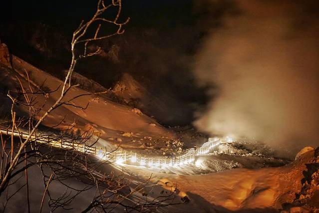 用完晚餐后,我们决定去地狱谷走一遭“鬼火之路”。天色已晚,我们三人磕磕绊绊往地狱谷方向走去,一路上能看到冒着滚烫蒸汽的间歇泉眼,喷涌的声音好像一辆老旧的火车正从地心深处驶来,却永远不曾到站。地狱谷的栈道两侧设有小灯,弯弯绕绕,灯光忽隐忽现,远远望去仿若幽冥鬼火,寒气沁人心骨。↓