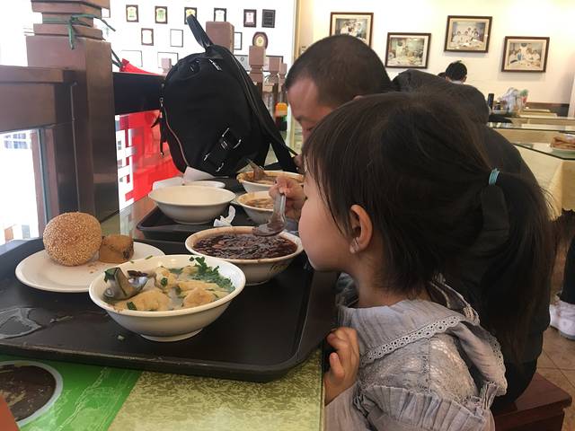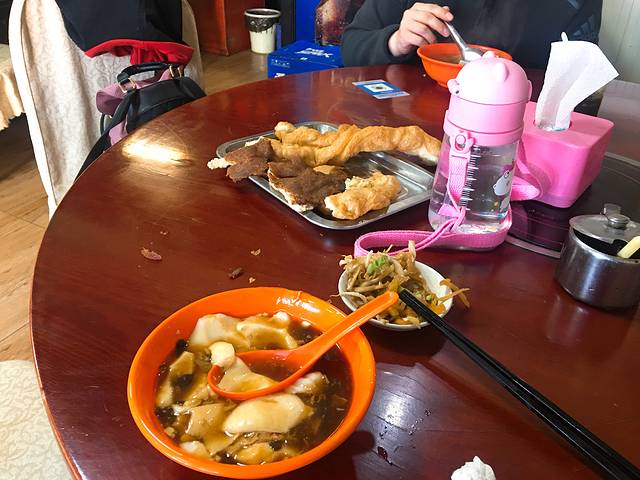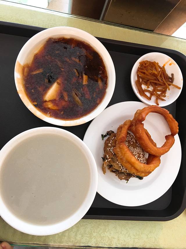 出门就有一家早点铺,豆腐脑还是叫豆腐脑,果子就不叫果子了,我说果子人家听不懂😂😂。果子叫油条,糖果子叫糖饼,果头叫油饼。豆浆没有盐,只能加糖😂,飞哥非常吃不惯。