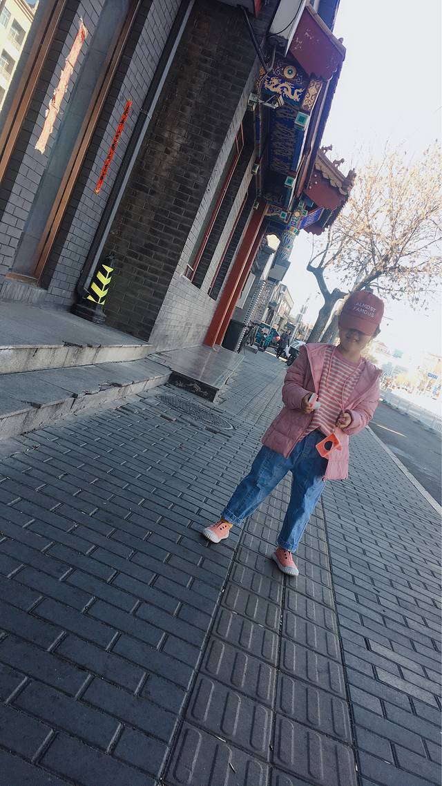 可乐下身穿的一条秋裤一条牛仔裤,上身一个背心一个体恤,外套是小薄棉服,十四五度的天气这样穿应该不冷了!