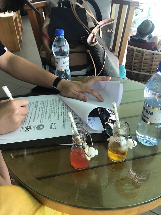 上岛后大家都会在前台坐下,会送来饮品,发几份单子填写,事实证明前台是整个岛最舒适的地方,海风阵阵,清爽宜人,躺在那里,发一天的呆,也是舒服的。