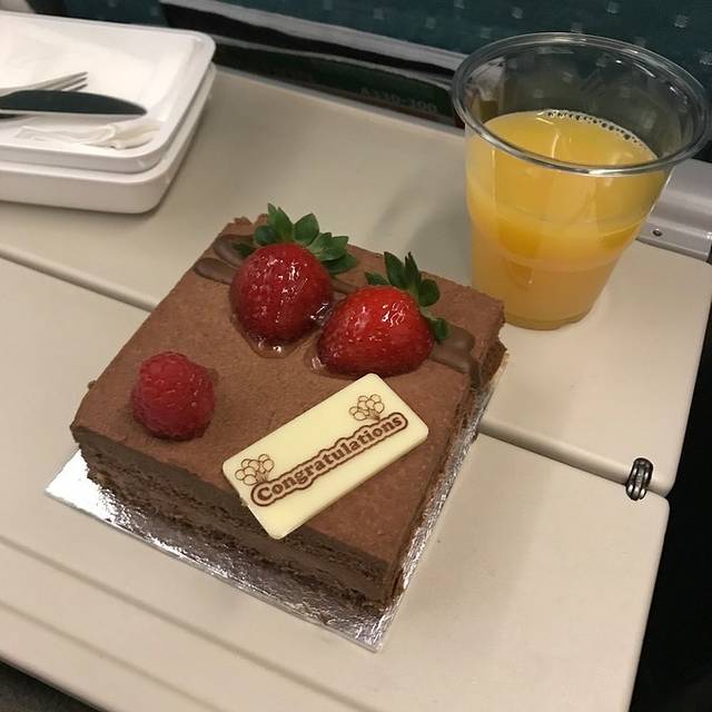首先送了我们蜜月蛋糕,很好吃的慕斯蛋糕,但当时遇到气流,我被颠的有点想吐,只吃了几口,但真的是好吃的哦。