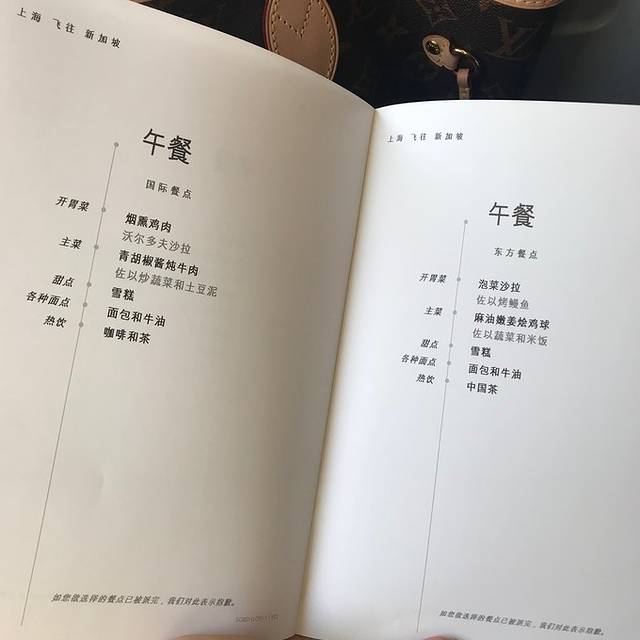 这是新航的菜单,一上飞机先发菜单,菜单有中文也有英文的。