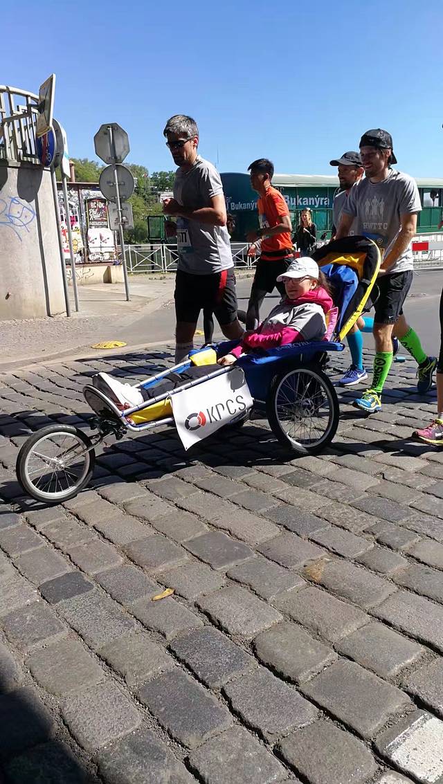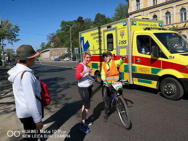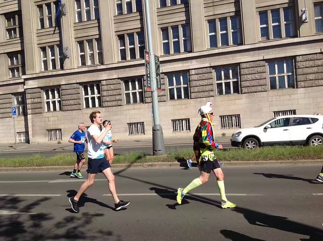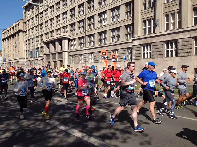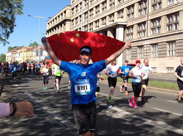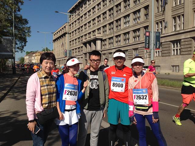 布拉格万人马拉松赛,是国际马拉松协会认定的国际金标赛事。洒导婷导小两口也是因参加这次赛事而精心策划了这次欧洲游。为了给他们加油,第二天我们早早等在马拉松要经过的公路边。整个赛道沿横穿布拉格城区的伏尔塔瓦河两岸,风景非常优美。马路上黑压压的选手奋力奔跑,时不时有举着中国国旗的选手跑过,我们激动得大喊加油,他们也欢快的回应着。我们的两个选手跑过来,哈哈,赶忙和他们合影留念吧。