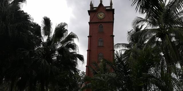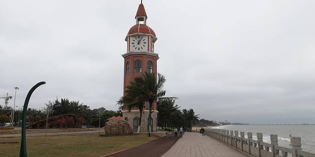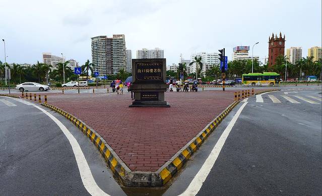 海口钟楼-(钟楼是海口市的八景之一、有悠久的历史、是海口的重要标志性和象征性的建筑物之一,据说是康熙二十四年(公元1686年)修建此钟楼,1928年由商人周成梅先生与国外的侨胞捐资仿照上海等城市钟楼特点,精心设计的海口钟楼哟。海口钟楼属一个混合式的建筑物,远远的就能看见高有五层红砖砌筑,最顶层中设有大钟,现在已经改为电子钟了)
