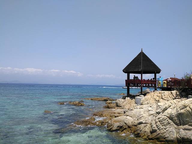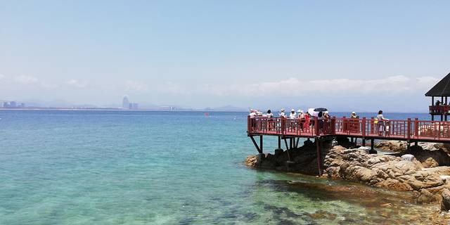 在蜈支洲岛西侧,沿海边地形修建了木质走廊和平台,可以沿着观海长廊走廊观看蜈支洲岛清澈的海水,这一带因为礁石比较多,所以可以看到很多螃蟹在礁石上“行走”。