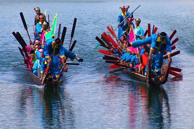 每年在 西双版纳 的泼水节的第一天,傣族人民都会在 澜沧江 举办隆重的赛龙舟活动。龙舟用铁椿木制造而成,龙舟的船身上绘有华美的彩纹,披红挂彩,在木雕的龙尾上插一根饰有彩带的竹竿,比赛时,舟中间站立1人击锣指挥,在规定的范围内,哪一队先到达目的地为胜。