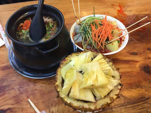 我们住的地方在七一街附近,走了不远便看见一条小吃街, 丽江 的一些名小吃都在里面,我们便决定在这里解决午饭。下图分别是米线、鸡豆凉粉和菠萝饭。鸡豆凉粉味道不错喔