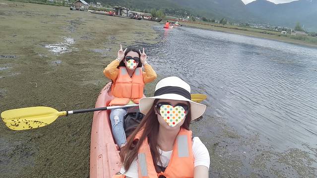 第一个项目皮划艇冲淡了我之前的愤怒与不舒服的感觉。我特别喜欢水,凡是景点里有江河湖海的,我都喜欢。即使这片湖的边缘处有许多绿藻,我能和水亲近还是觉得很开心。