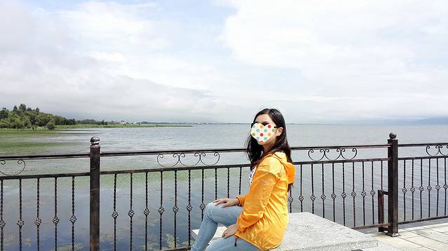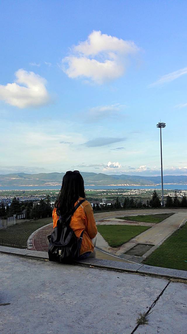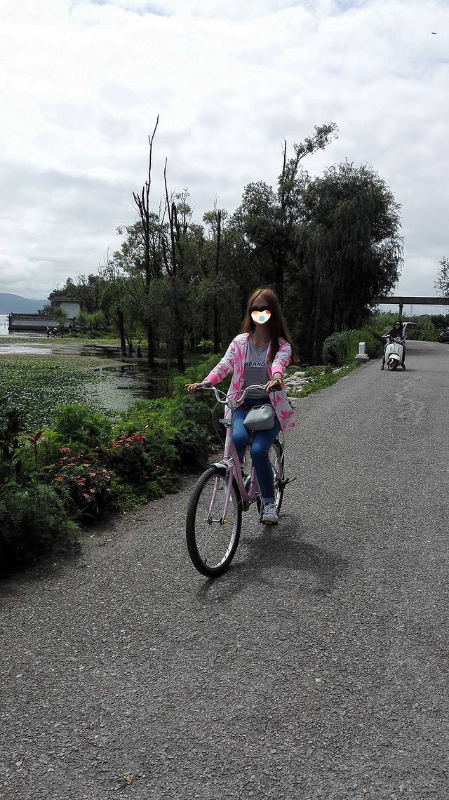 没有帅哥带路,我们也只得硬着头皮往前骑,还好后面有路牌指引,我们顺利地上了环 海西 路。骑了不远,就有个观景点可以看到洱海了。