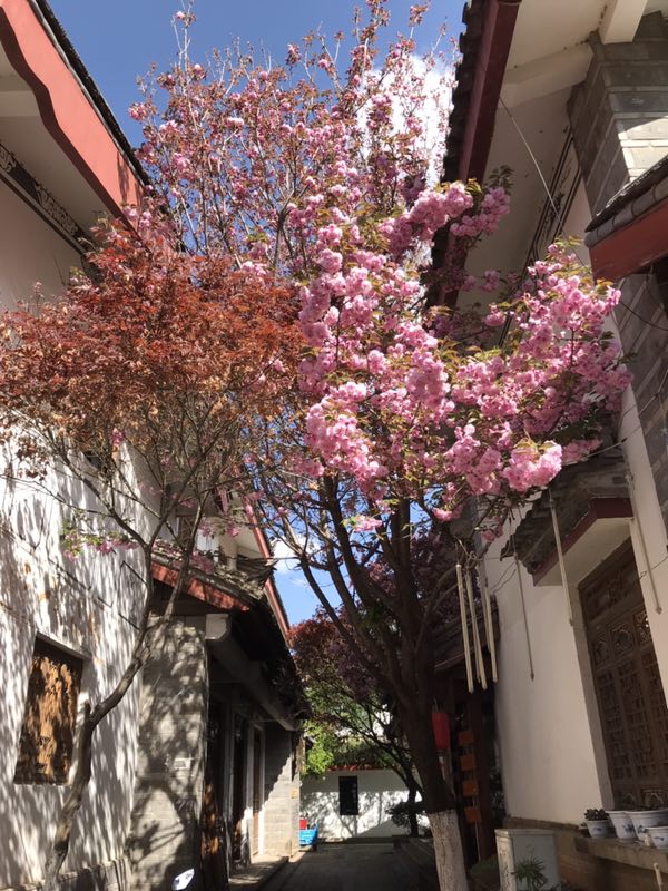 拉着行李坐上机场大巴,缓慢行进颠簸着的大巴带我很快进入了梦乡,不知过了多久被老板的电话叫醒,问我们多久到。放下电话的5分钟后,我们到达了大巴终点站——蓝天宾馆。按照老板的指示,我们从蓝天宾馆打了个滴滴到古城边上,在车上的时候热情的老板又来电话了,说一会过来接我们。