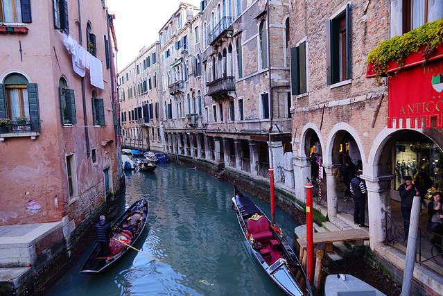 穿行在威尼斯的小巷中,可以看到各式各样的桥,形态各异,千姿百态,有著名的叹息桥,宪法桥、里亚托桥、乳房桥,还有很多不知名的桥,把威尼斯小巷相连。据说有3000多条小巷,所有的游人都拿着手机在导航,但是导着导着还是迷路了,goole在这里也找不到北,最好放弃手机,迷路也是威尼斯游玩的一种乐趣,有时还有意外的惊喜。跟着人流走,所有的小巷最后都会通往圣马可广场。