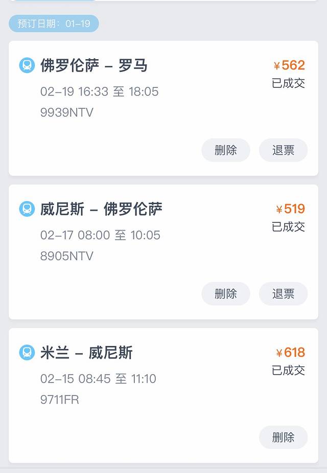 携程上预订的火车票,显示的价格是3个人的,意大利的车票价格很灵活,因为有两家铁路公司在运营,分别是Trenitalia 和NTV,Trenitalia是国营铁路公司,是意大利最大的列车运营公司,NTV是民营铁路公司,只运营热门大城市线路,列车颜色为红色。为了吸引顾客随时都会推出各种优惠政策,所以每天查的价格都会不同。如果能抢到特价票,就相当划算了。