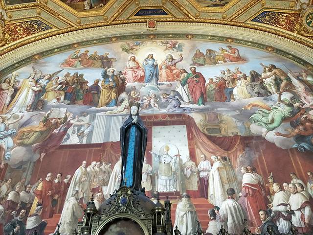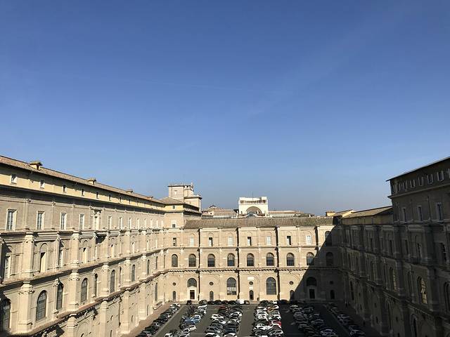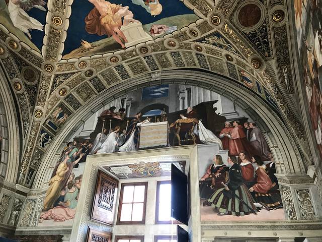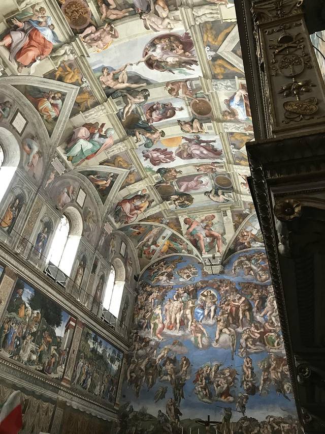 米开朗基罗在西斯廷礼拜堂的巨作《创世纪》和《最后的审判》,一走进西斯廷教堂,立马被满天满地的壁画震撼到了,天呀,这怎么画上去的,而且还画得那么逼真,人物栩栩如生,充满了立体感。这里面是不允许拍照的,出门的时候偷偷扭头拍了一张。教堂顶部是《创世纪》,据说这幅大型壁画耗费了4年多才完成。