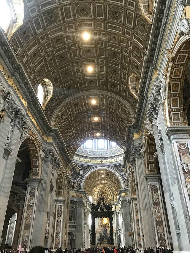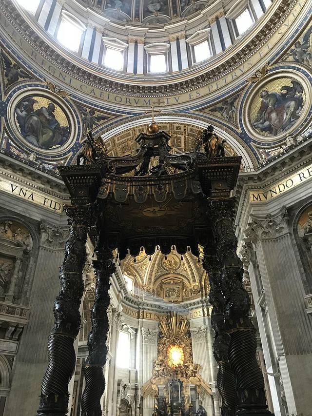 教堂内部装饰华丽,华丽到令人窒息。大教堂中《天幕下的圣彼得》这件又贝尔尼尼亲自完成的青铜滑盖,足足有五层楼高,由4根20米高、异常华丽的螺旋纹铰链铜围城,青铜华盖直耸入穹顶,仿佛直达天堂。