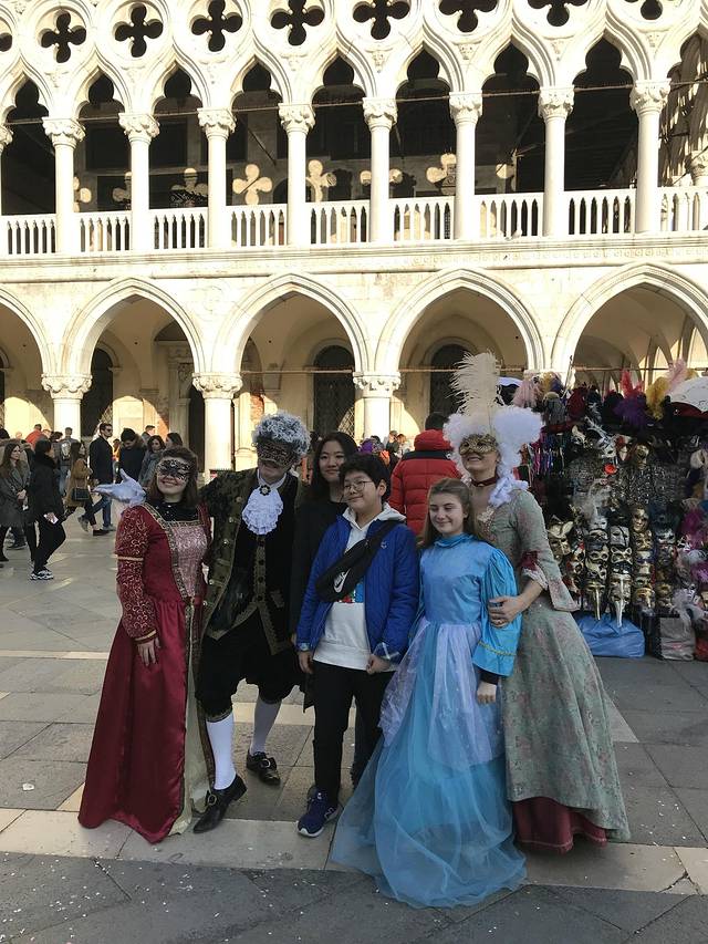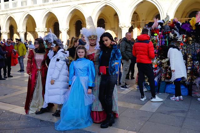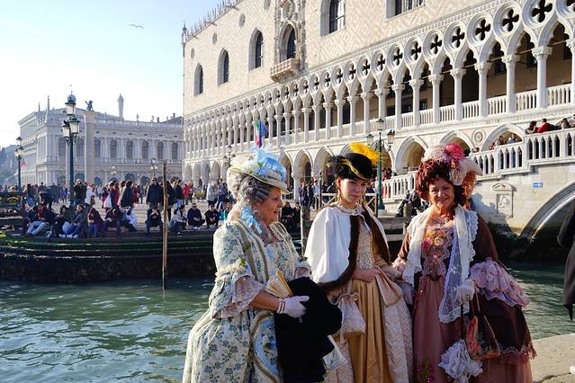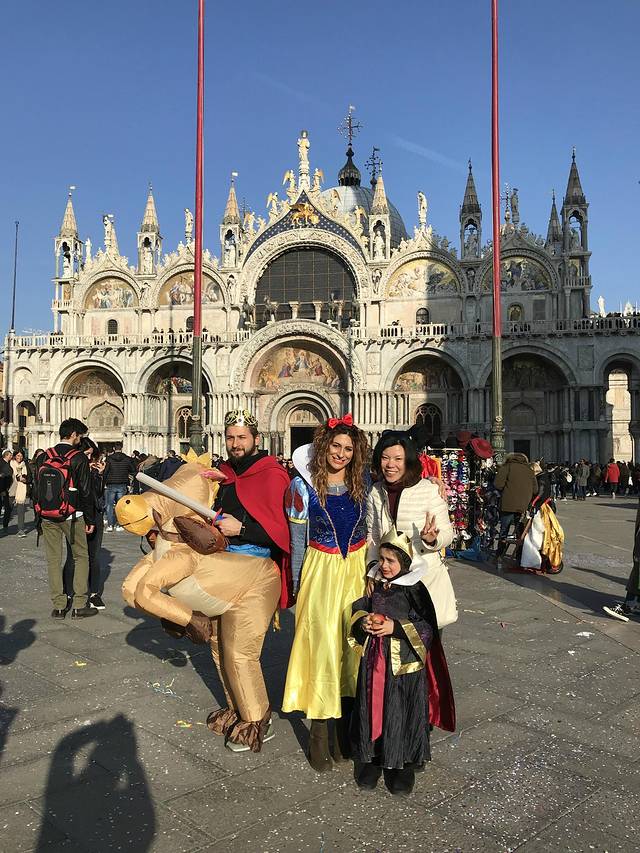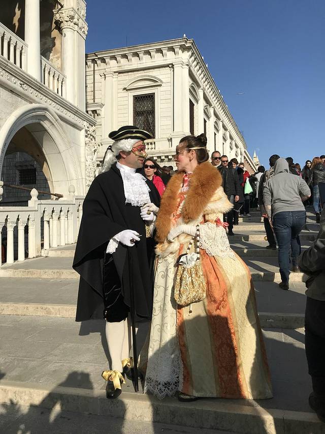 我们拜访的意大利第二个城市是威尼斯,从小从课本上就知道威尼斯,大名鼎鼎,就不多说了。我们去的时候正赶上威尼斯的狂欢节,之前功课没做好,不知道有狂欢节,运气较好就碰上了。狂欢节一般就在我们春节前后,每年的时间不一样,是根据复活节的时间来确定,如果想去狂欢的伙伴们可以关注一下。但狂欢节期间房价特别贵,比平时的价格要高上2-3倍。但可以体验不一样的威尼斯,整个威尼斯的人好像都出动了,从早到晚都充斥着鼎沸的人群,他们穿着宫廷华美服饰,头顶假发,戴着各种夸张的面具,在大街小巷里优雅的走着,或在广场上翩翩起舞,感觉一下穿越到了中世纪。就连平时很难看到的警察,狂欢节期间全部出动来维持秩序。