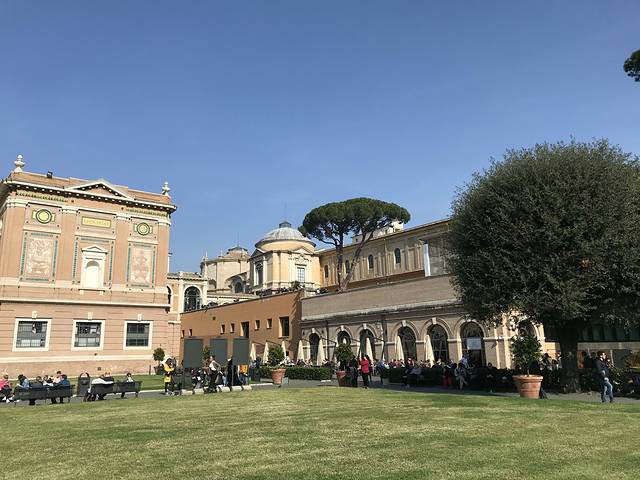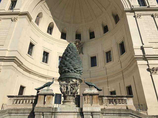 松果庭院 是16世纪时博物馆一庭院,部分加屋顶成了室内展室,而这个庭院被分离出来,这是一个收尾壁龛,这个顶,就是参照万圣殿拱顶的设计,由建筑师利高里奥于1565年建造,意大利早已把建造拱顶当成他们的专利技术。