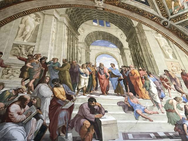 拉斐尔最伟大的作品之一,《雅典学院》(La Scuola d’atene),博物馆镇馆之宝。画内绘有哲学家们和学者们围着柏拉图和亚里士多德亲密交谈的场景。台阶前的高个子据说是当时正为西斯廷教堂创作壁画的米开朗基罗。这幅画所体现的创作风格更壮观、色彩更强烈、刻画人物形象的重点也更突出。