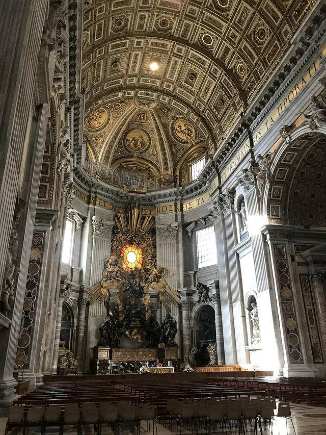 圣彼得宝座,也是贝尔尼尼的作品,宝座上方是於光芒四射的荣耀龛及象牙饰物的木椅,椅背上有两个小天使,手持开启天国的钥匙和教皇三重冠。